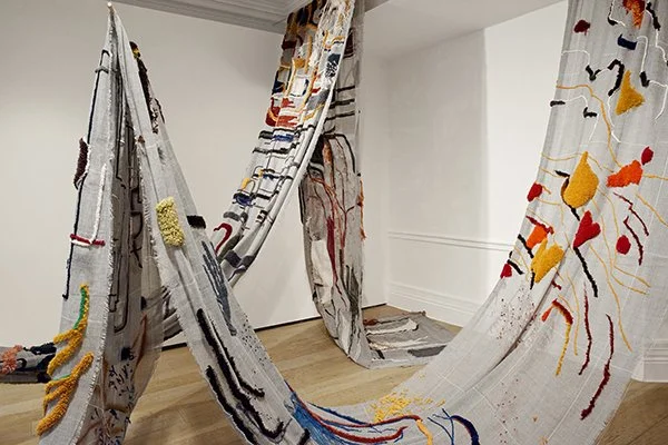 100 Acres is composed of two twenty-five yard cuts of monkscloth that are sewn, embroidered, knotted and tufted. In a refusal of distantism - the belief that the world is given to us in the establishing shot of overview - the work recalls the lived encounter of the forest as lived through the 3Ecologies Project. A project that aims to engage in parapedagogies of resistance, 3E is concerned with giving land back to itself by purchasing it and taking it out of the property market. It is also interested in fostering techniques for other ways of living and learning. The forest in the work is a speculative garden, a incitement for other ways of touching existence. Deeply engaged with the ProTactile movement, it asks how else the world calls us to sense.
